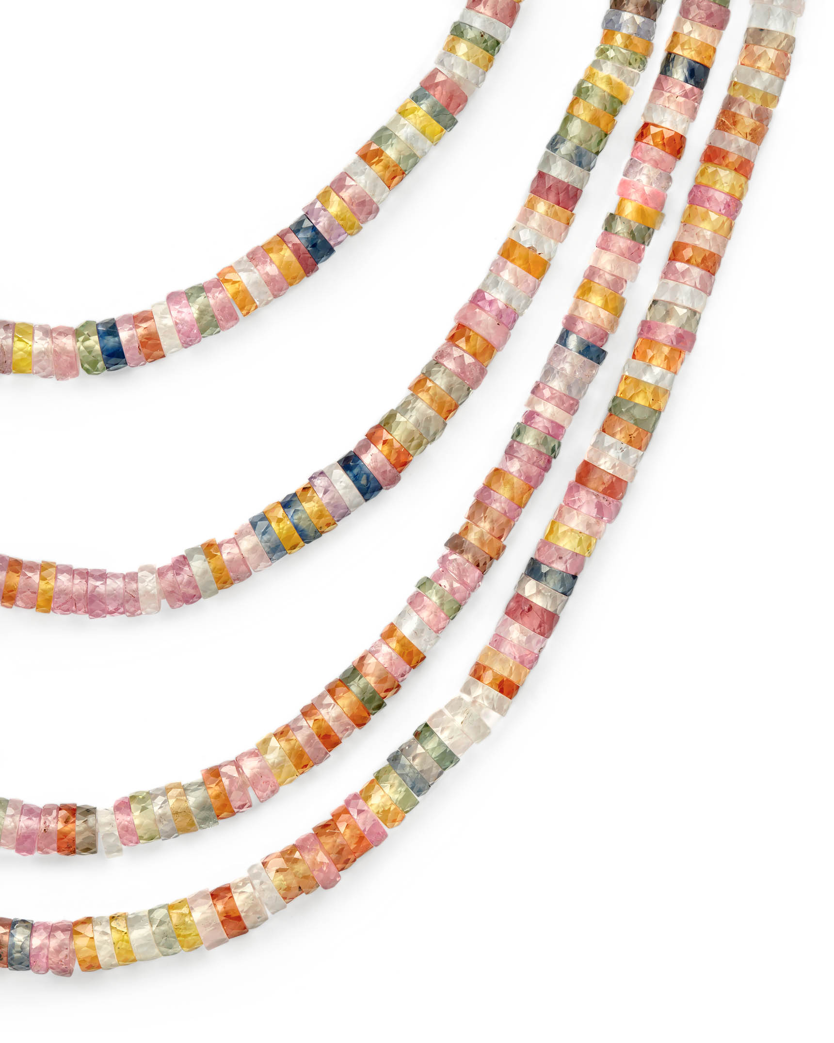 4-strand natural multi-color sapphire bead necklace with an 18 karat yellow gold hook and eye clasp.