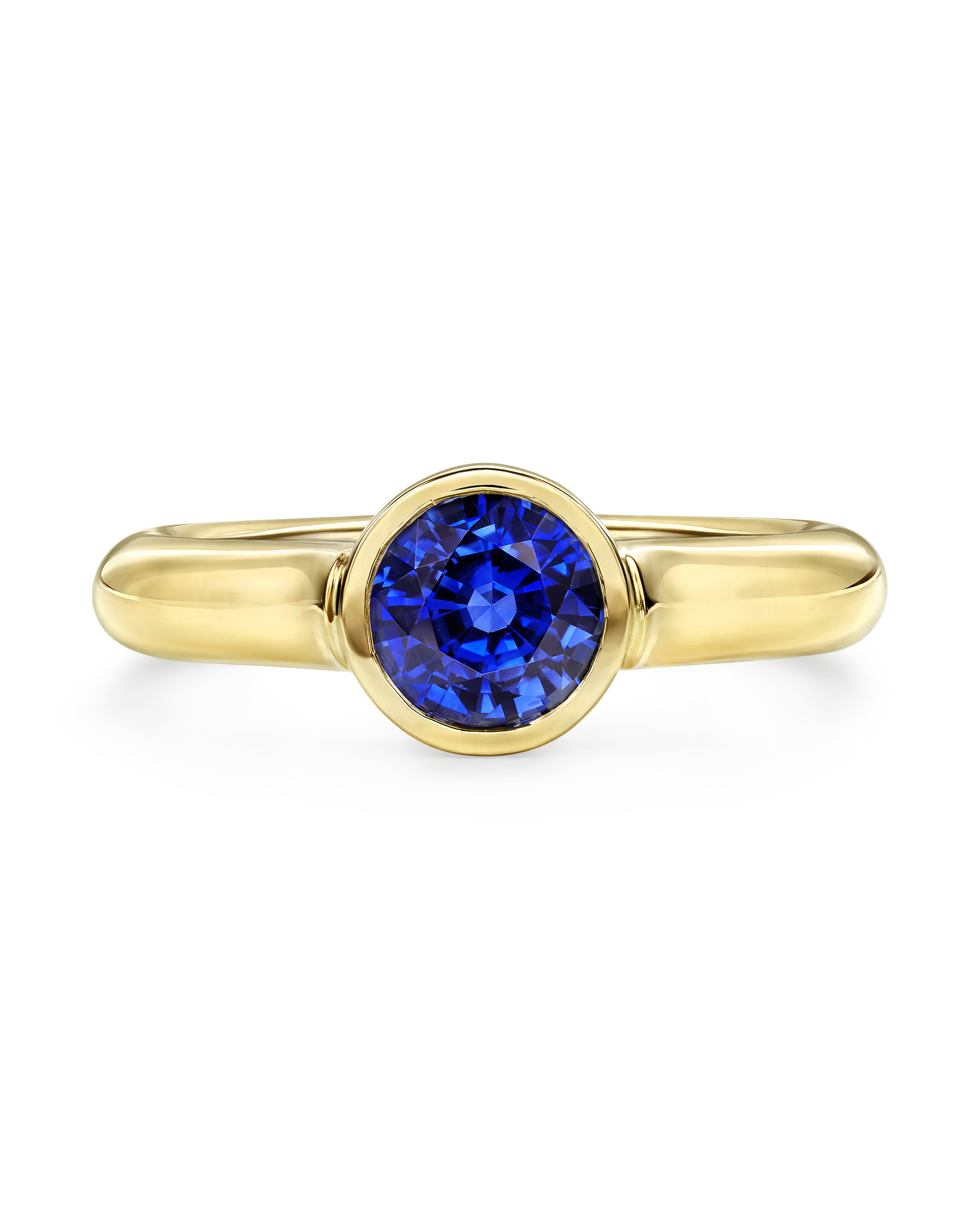 18k yellow gold ring bezel-set with a 1.59 carat very fine round blue sapphire.