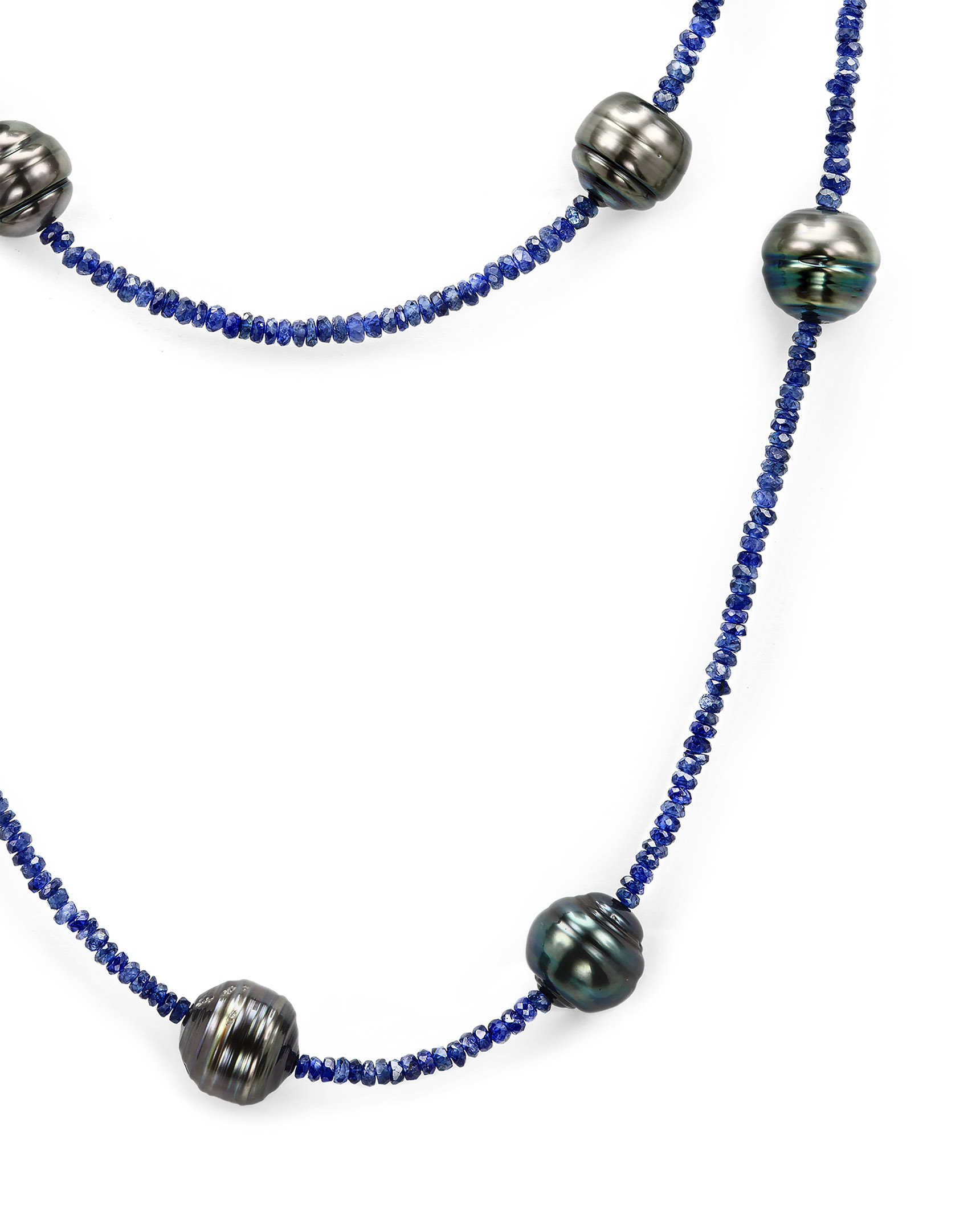 Beautiful faceted blue sapphire bead necklace adorned with 16 Tahitian pearls.