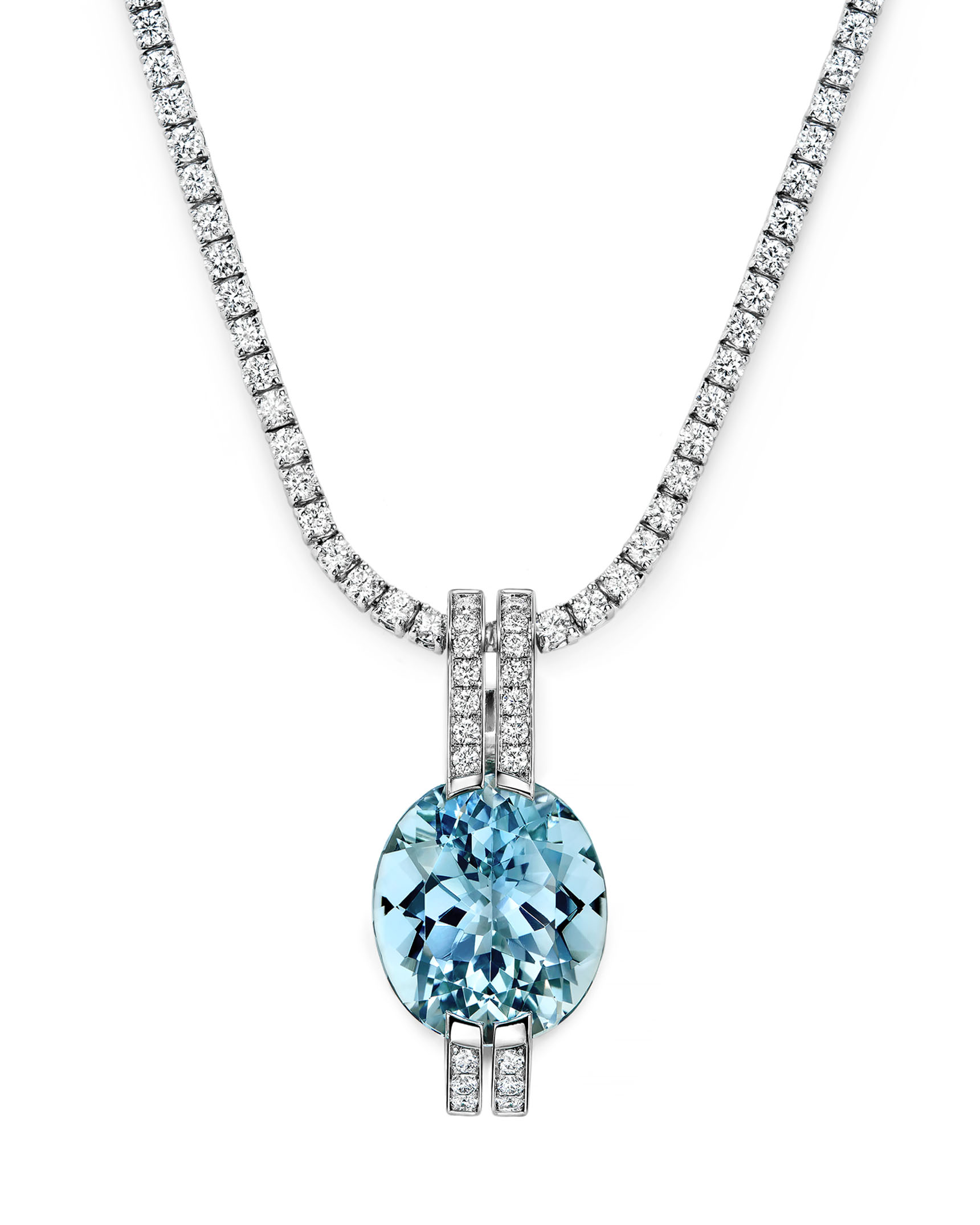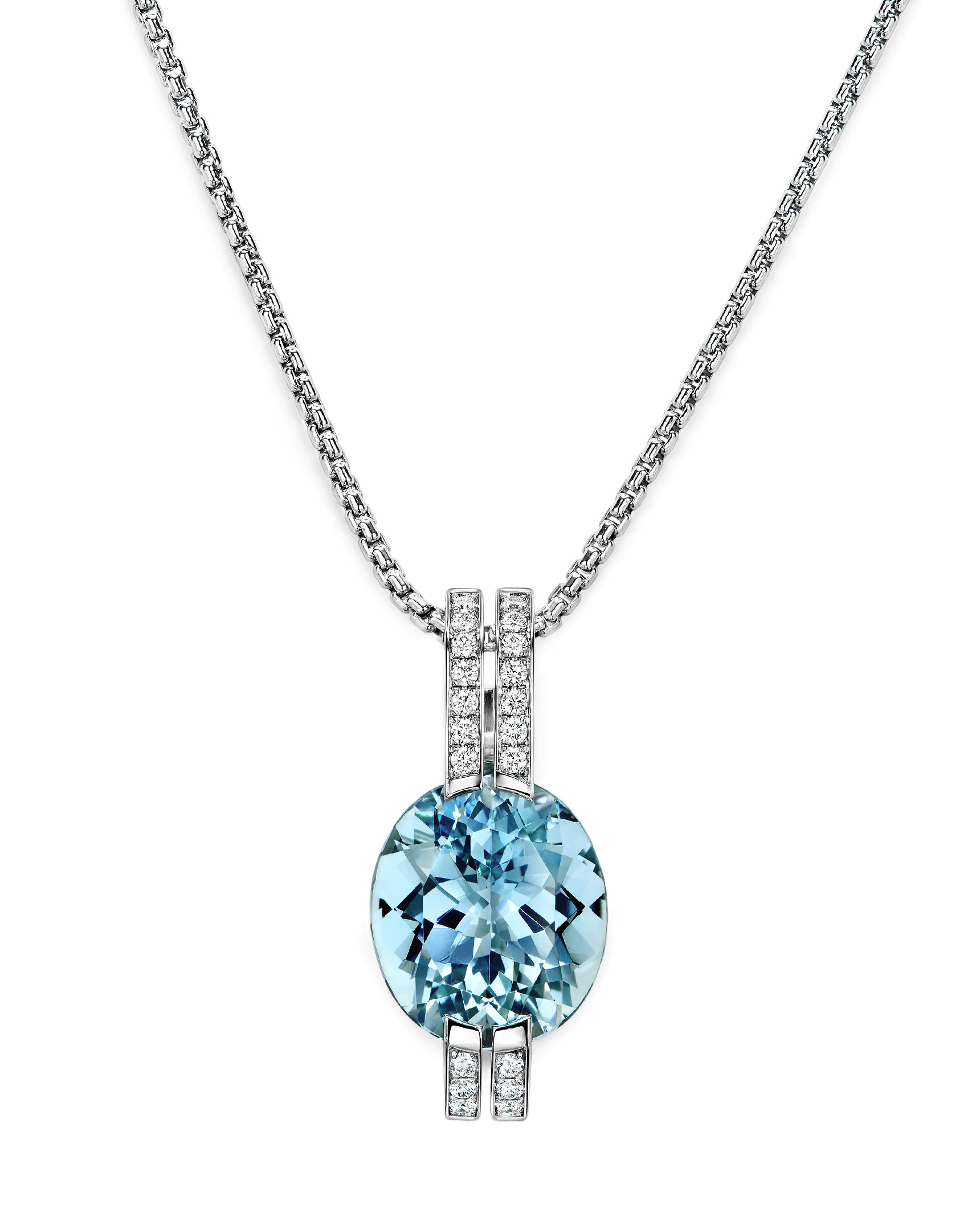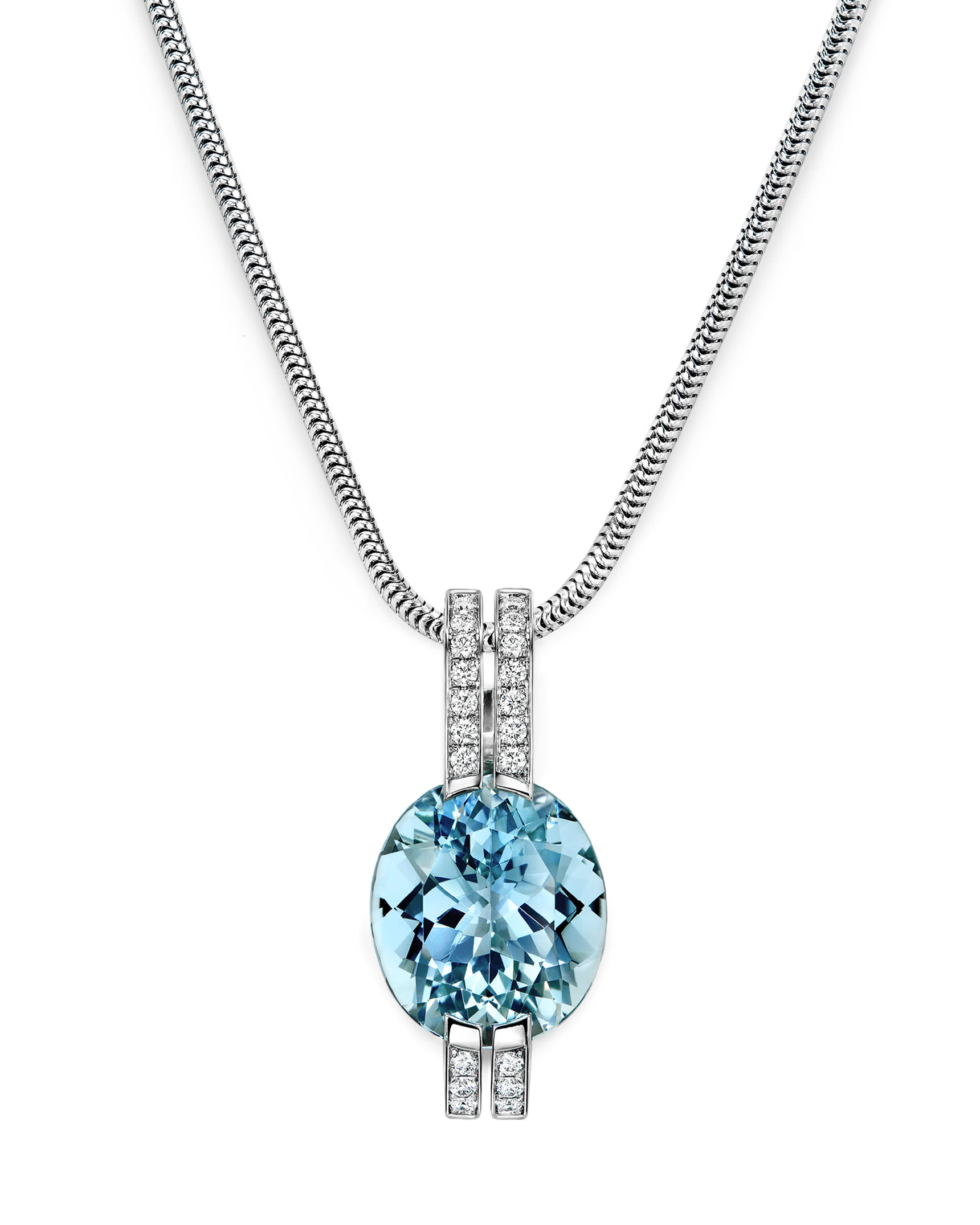 18 karat white gold pendant set with a 7.75 carat, oval Brazilian aquamarine surrounded by a double row of round brilliant cut diamonds (total weight of 0.20 carats, G-color and VS-1 clarity).