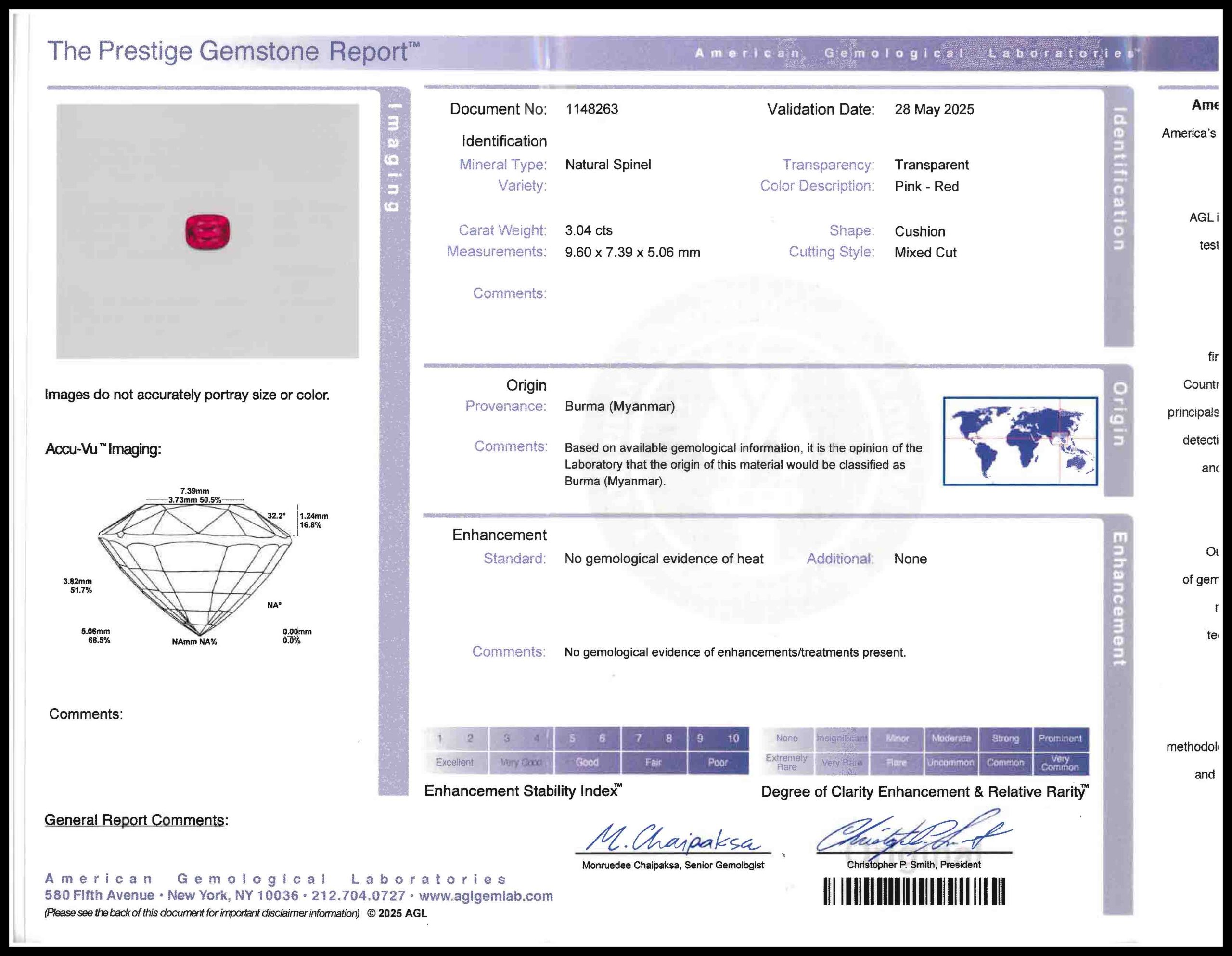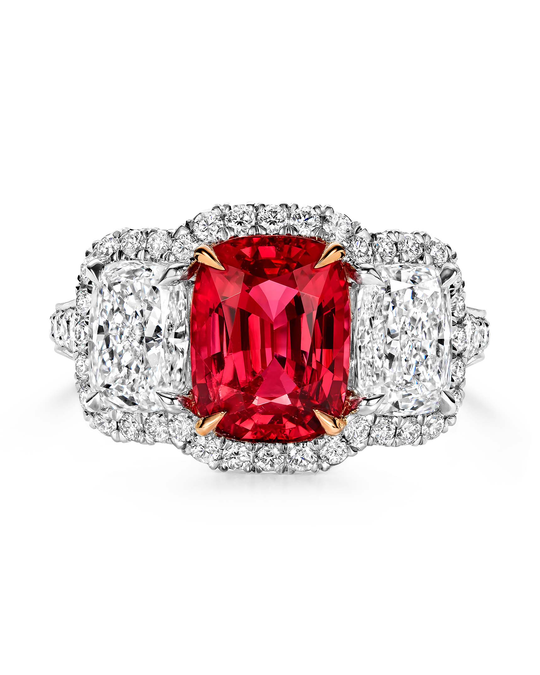 Platinum and 18 karat rose gold ring set with a 3.04 carat, cushion-cut Burmese pink-red spinel surrounded by 2 cushion-cut diamond side stones (total weight of 2.08 carats, E-F color and VVS1-VS1 clarity), 54 round brilliant cut diamonds in a halo and 3/4 of the way around the band (0.79 CTW), and 34 round rubies in the undergallery set in 18 karat rose gold.