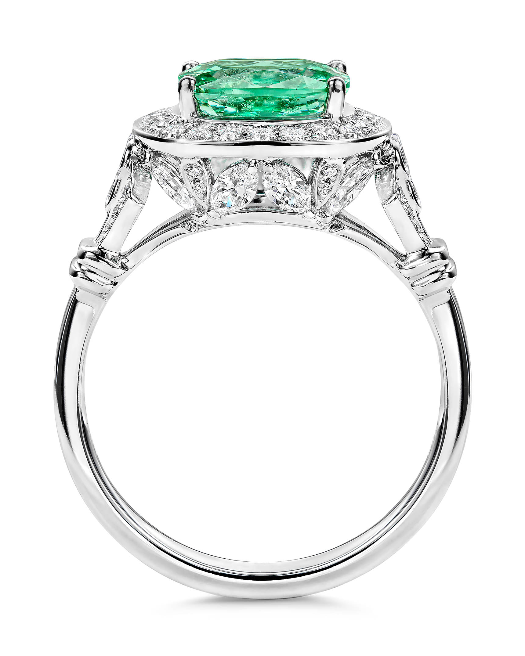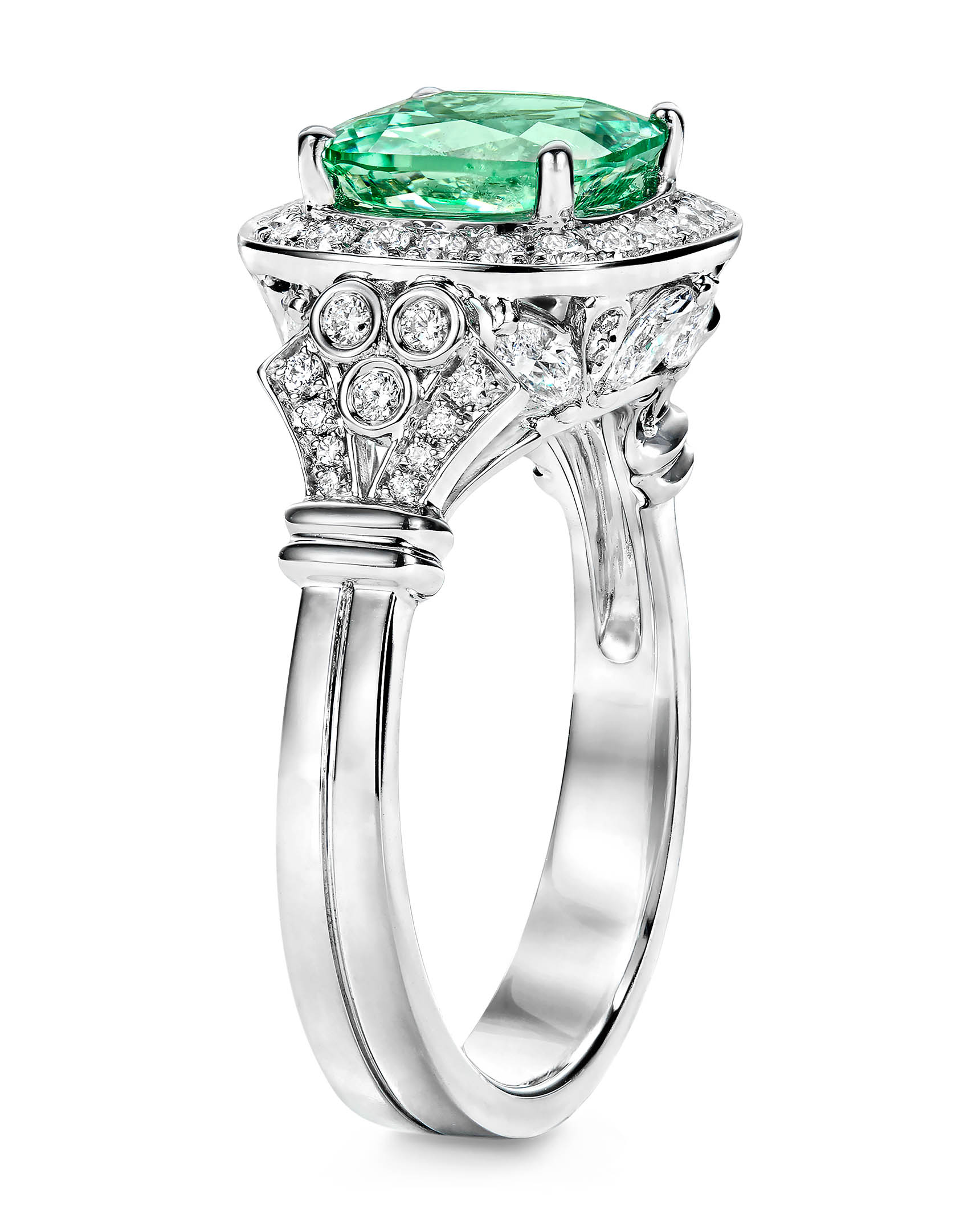 18 karat white gold ring set with a 2.01 carat, cushion-cut Columbian mint beryl center surrounded by 60 round brilliant cut diamonds and marquise-cut diamonds (total weight of 0.75 carats, H-I color and SI-clarity).