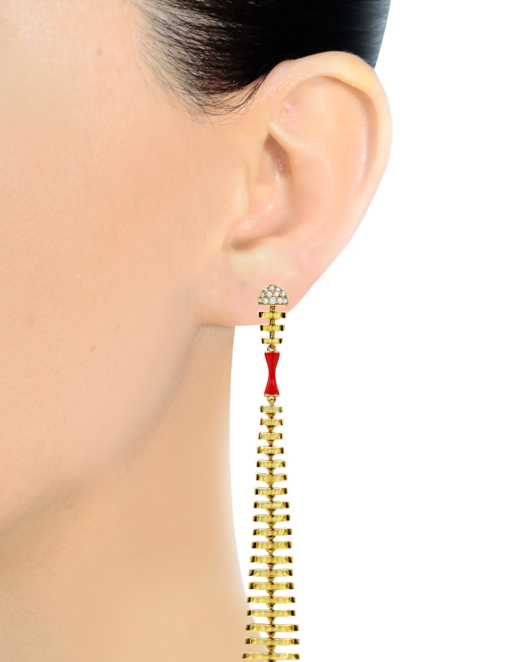 Pair of 18 karat yellow gold Christmas dangle earrings set with pavé round brilliant cut diamonds (total weight of 1.48 carats), red enamel hourglass and yellow gold discs in graduating sizes.