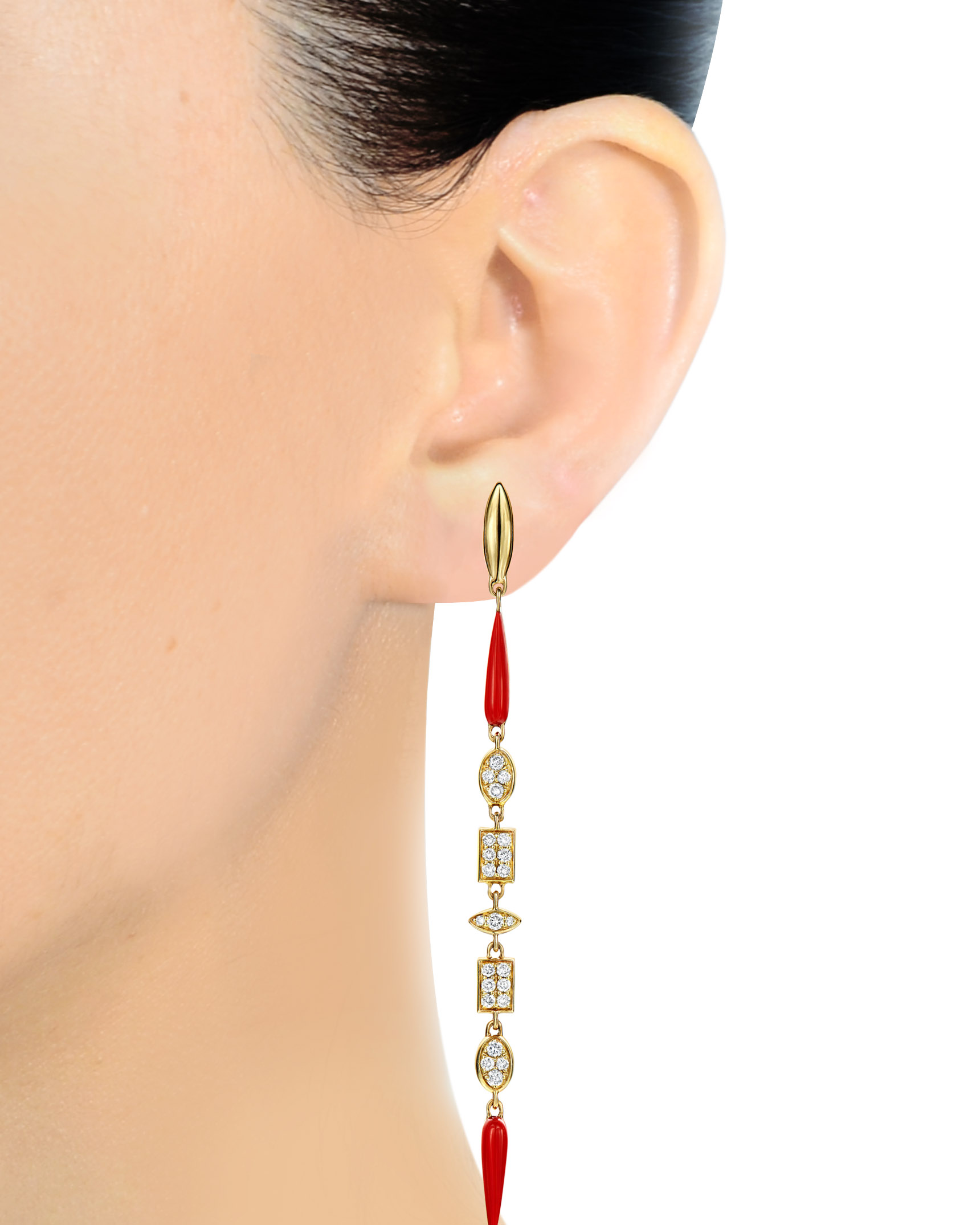 Pair of 18 karat rose gold dangle earrings set with 46 round brilliant cut diamonds (total weight of 0.63 carats) and hand-carved red ceramic enamel.