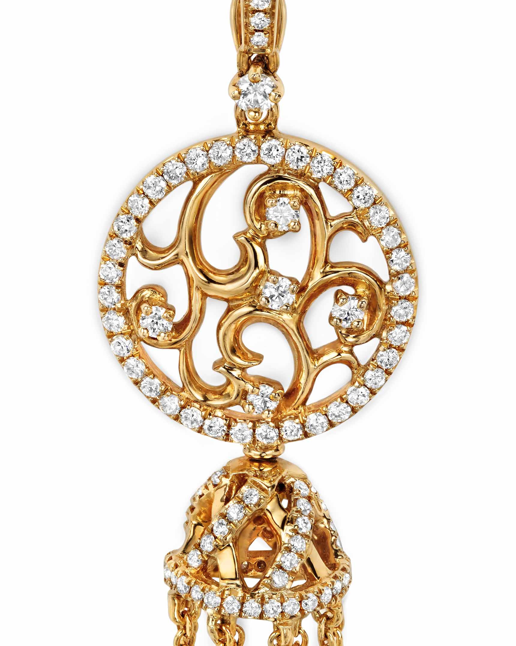 An 18k rose gold pendant with a French swirl motif featuring 8 strands set with a combined 113 round brilliant cut diamonds (total weight of 0.53 carats, G-H color and VS-clarity).