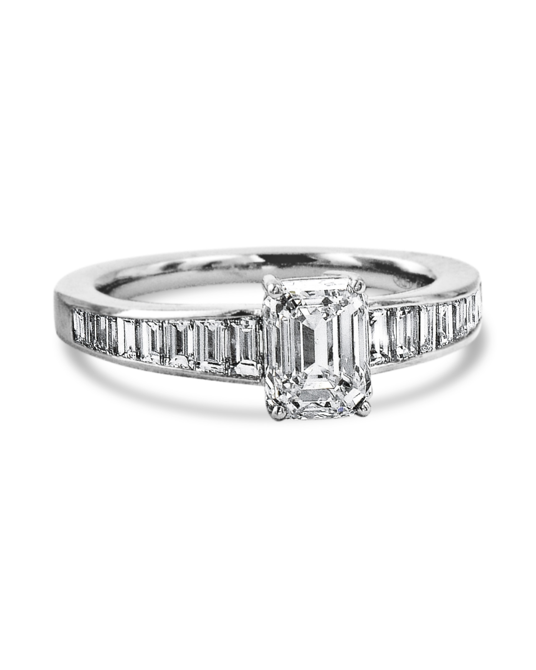 Platinum ring set with a 1.20 carat emerald-cut diamond center (G-color and VVS-2 clarity) surrounded by 16 tapered baguette diamonds (total weight of 0.72 carats, G-color and VVS-2 clarity) halfway around the band.