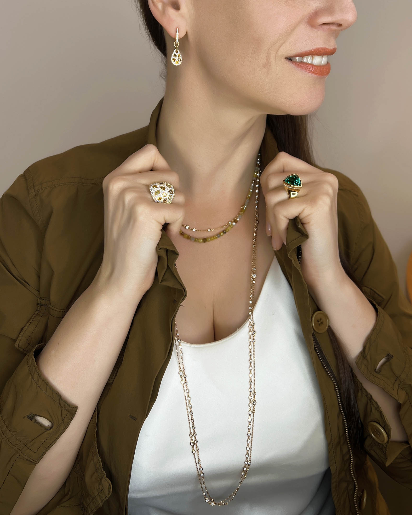 Soft-toned 18k rose gold earrings with 10 mixed fancy colored diamonds (total weight of 0.80 carats) with 180 round brilliant cut diamonds (0.86 CTW) in a tear drop shaped profile that is simply flattering.