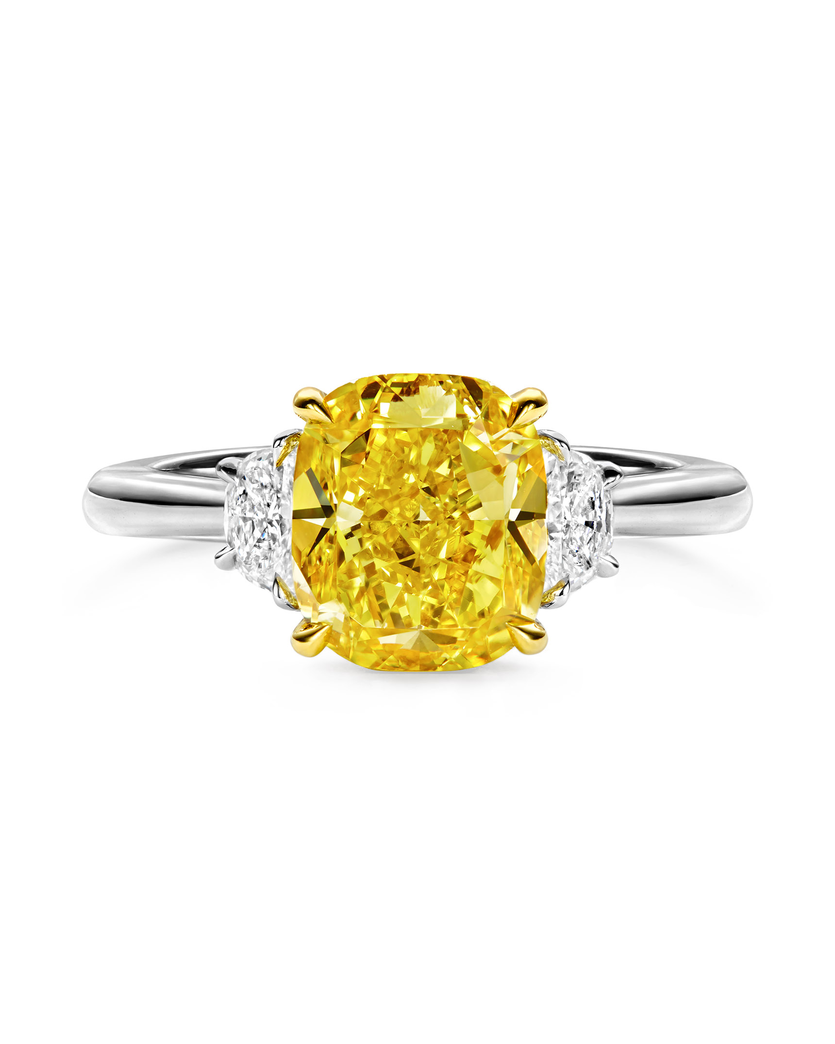Platinum and 18 karat yellow gold ring set with a 3.03 carat, cushion-cut fancy vivid orangy yellow diamond (VS-1 clarity) surrounded by 2 half moon diamond side stones (total weight of 0.41 carats, F-color and VS-clarity).