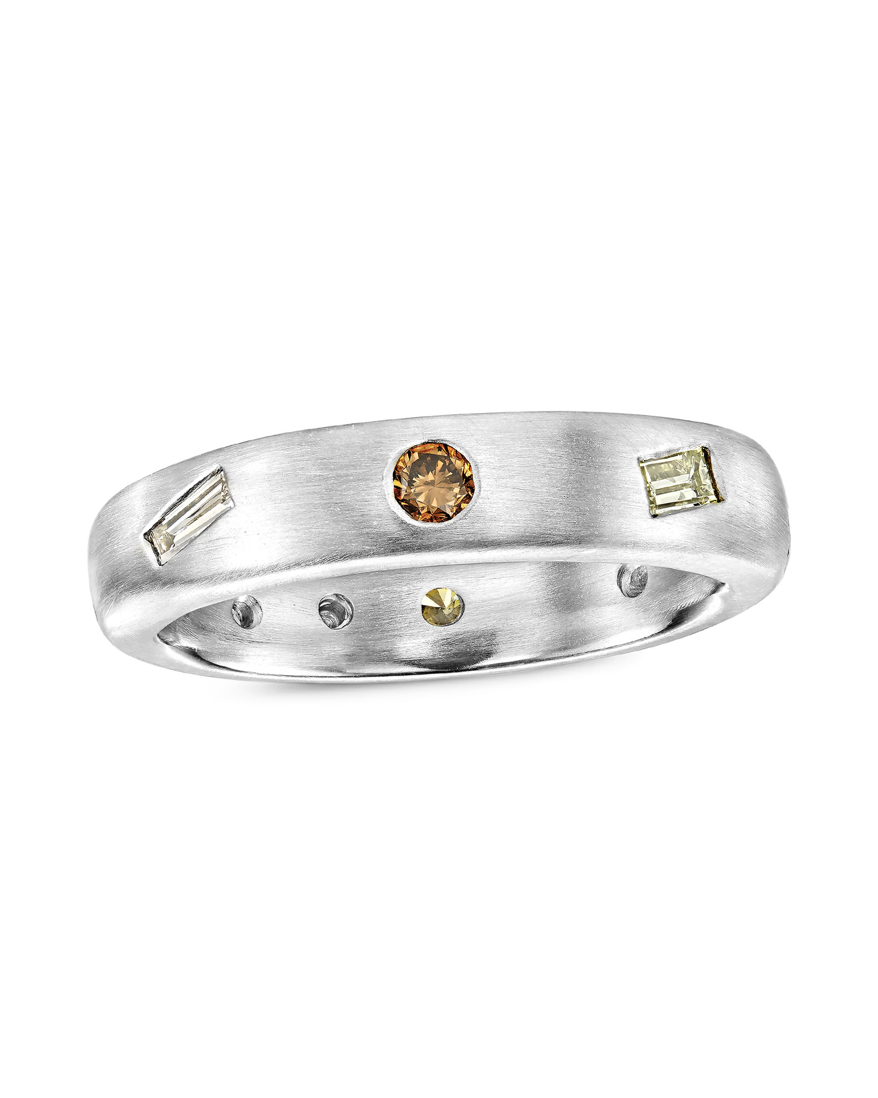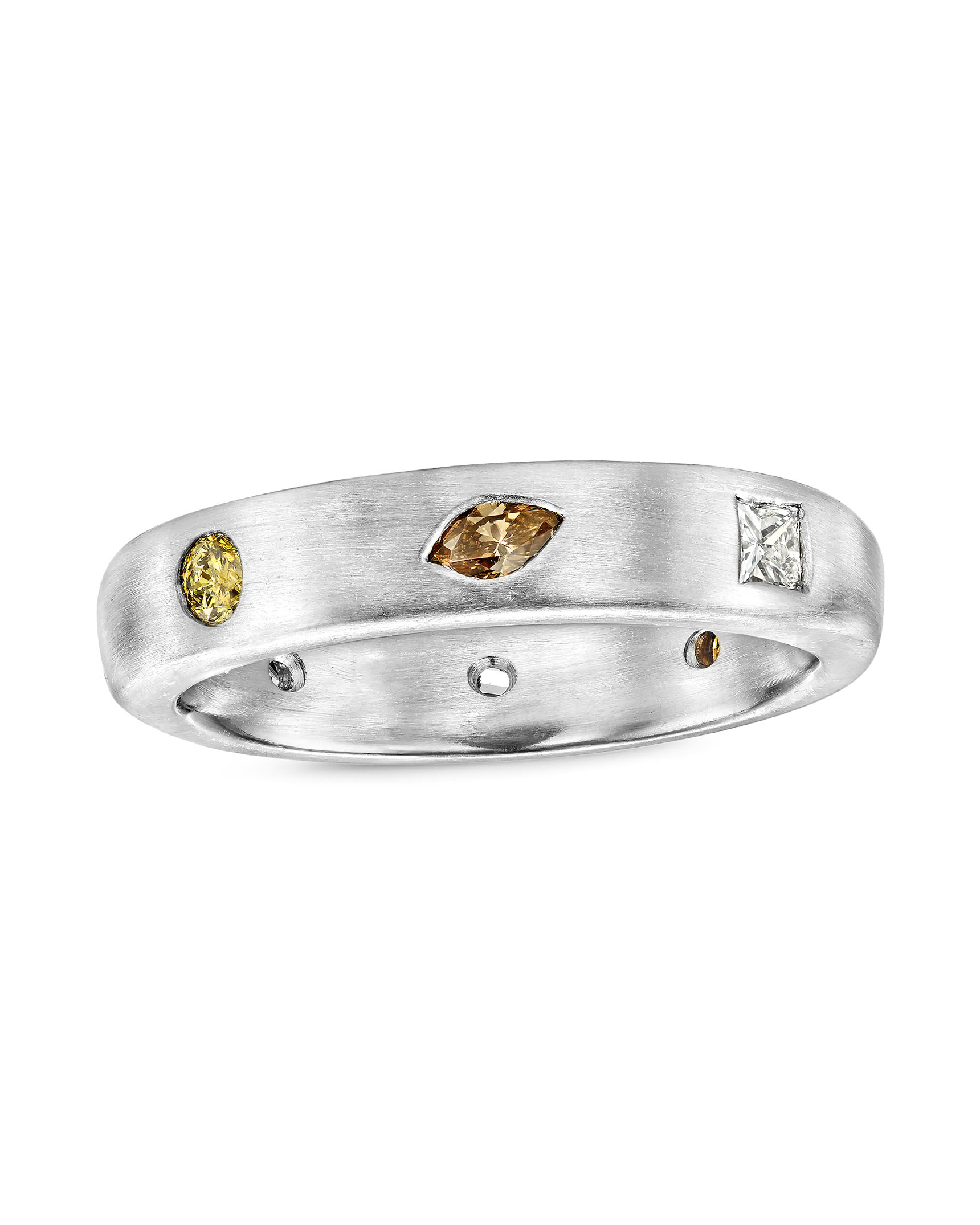 Matte finished platinum ring set with 8 mixed diamonds in a variety of shapes and colors (total weight of 0.67 carats).