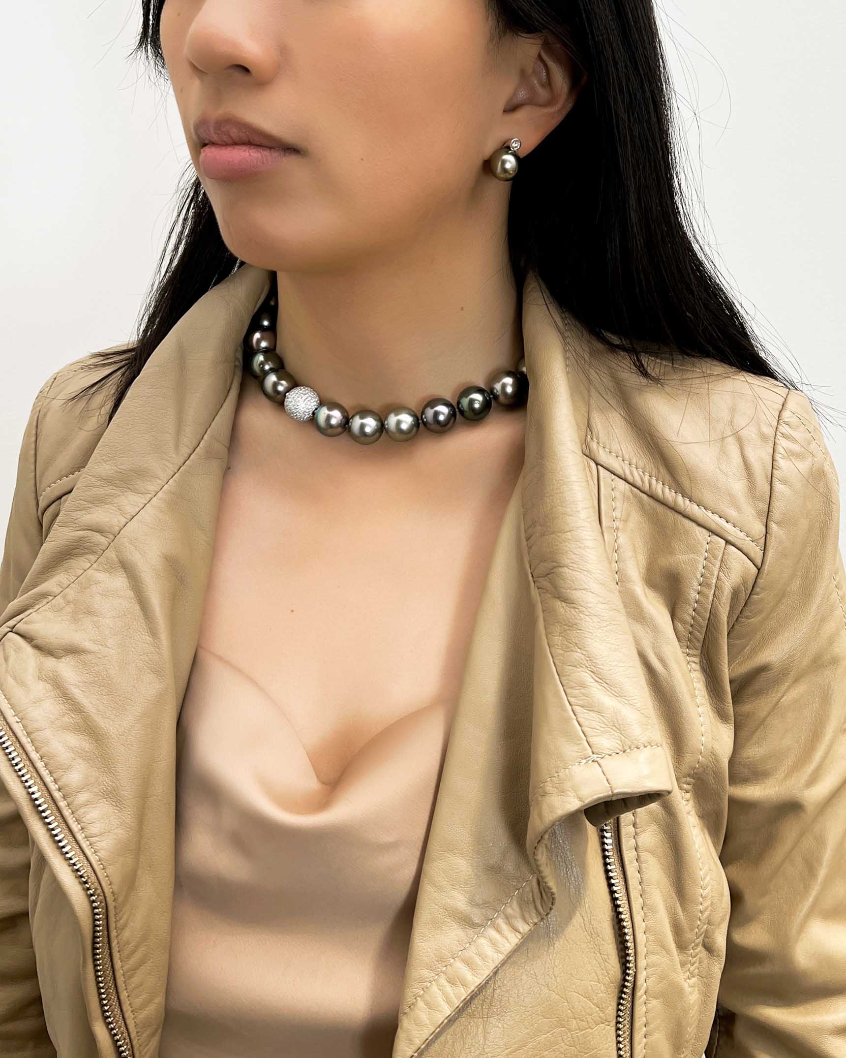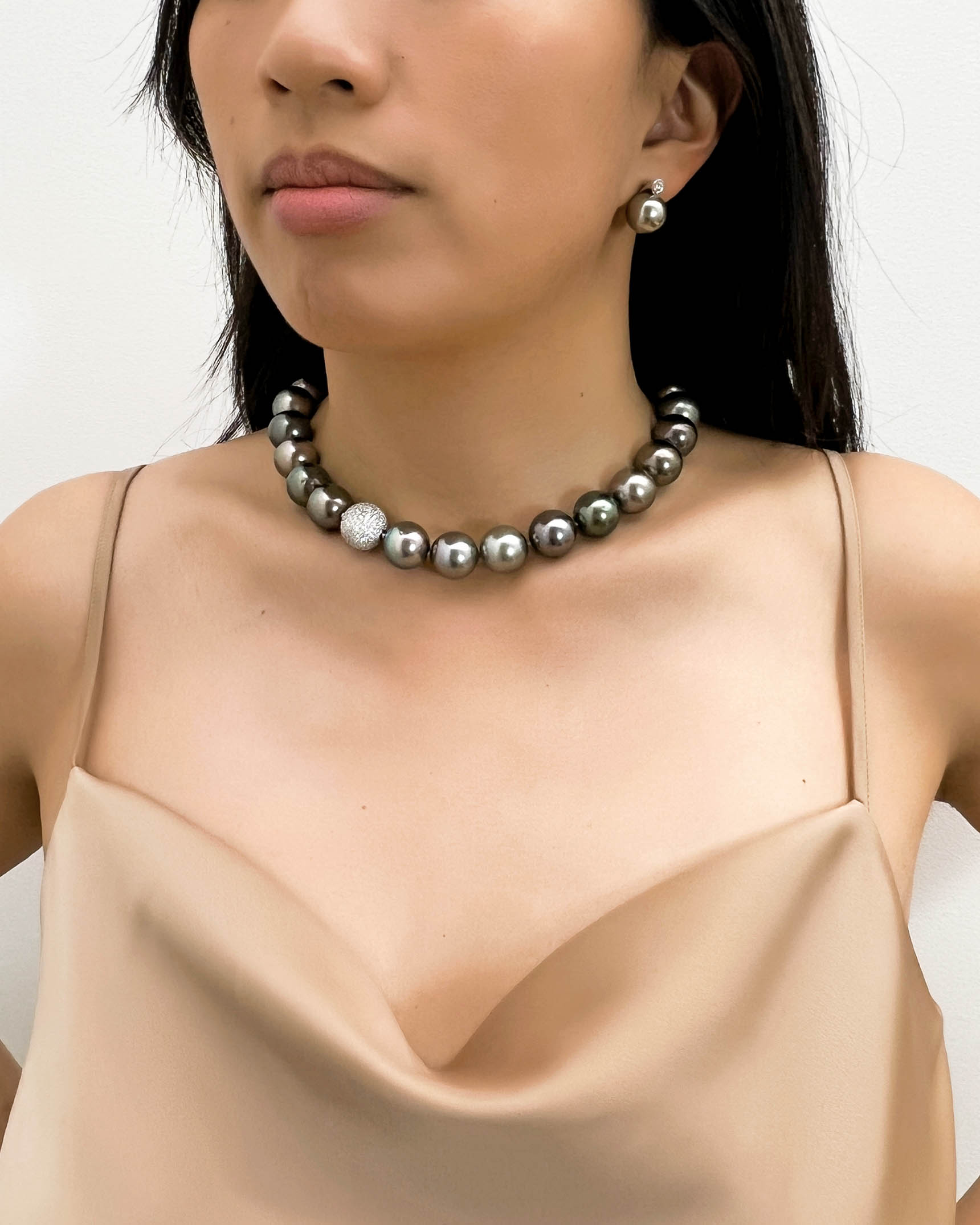 Multi-colored Marutea Tahitian pearl necklace with an 18 karat white gold rondelle ball clasp pavé-set with a total 258 round brilliant cut diamonds (total weight of 4.91 carats).