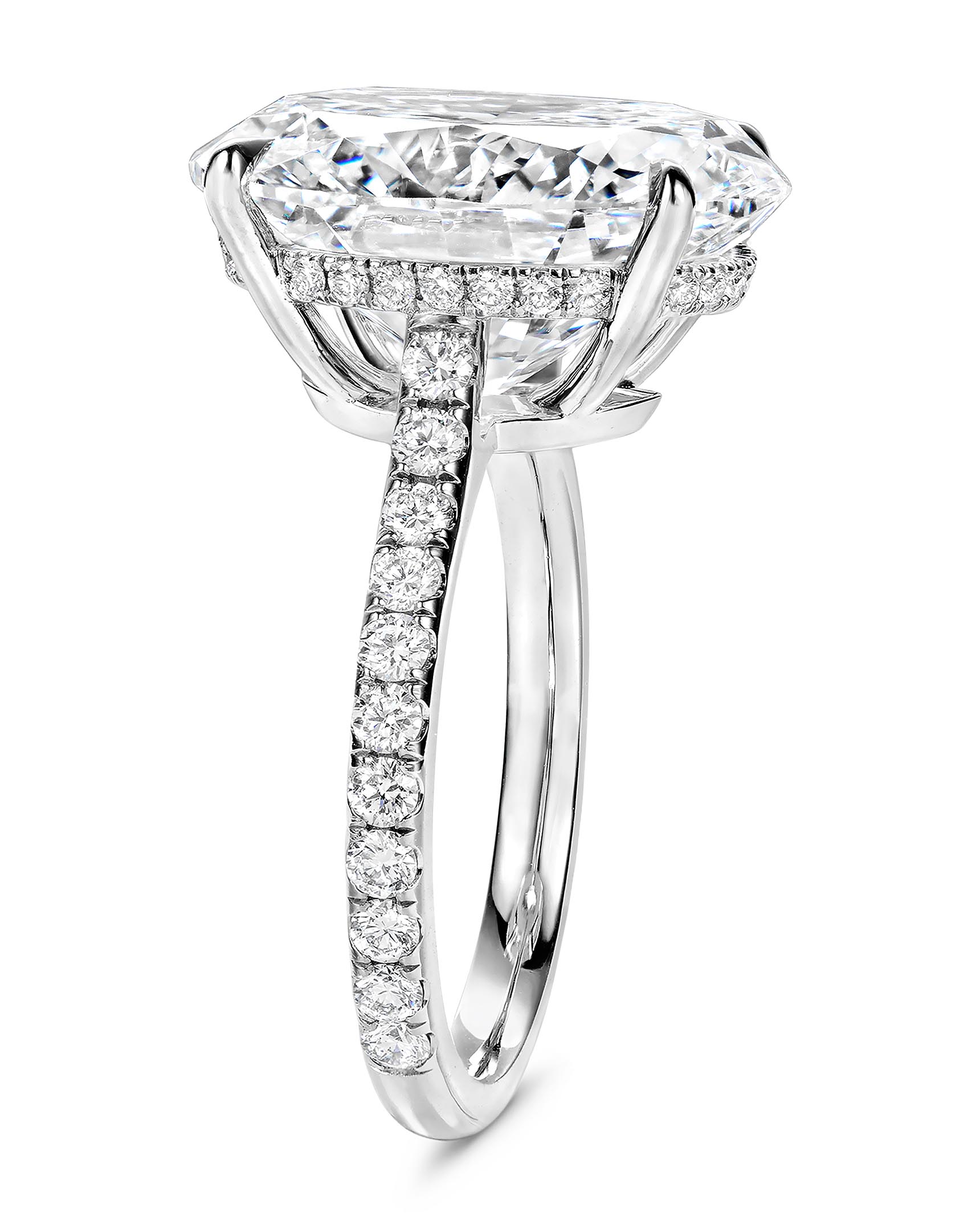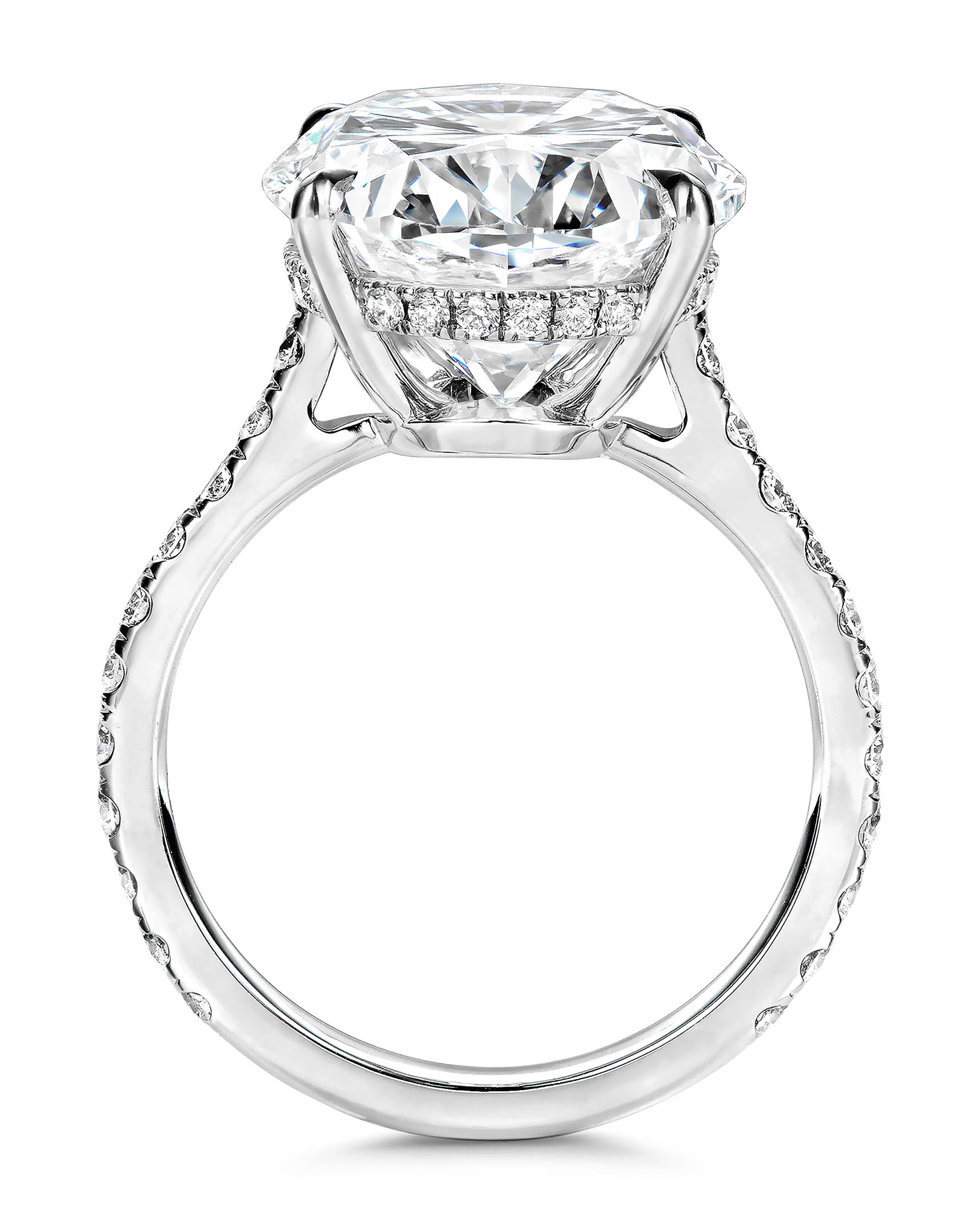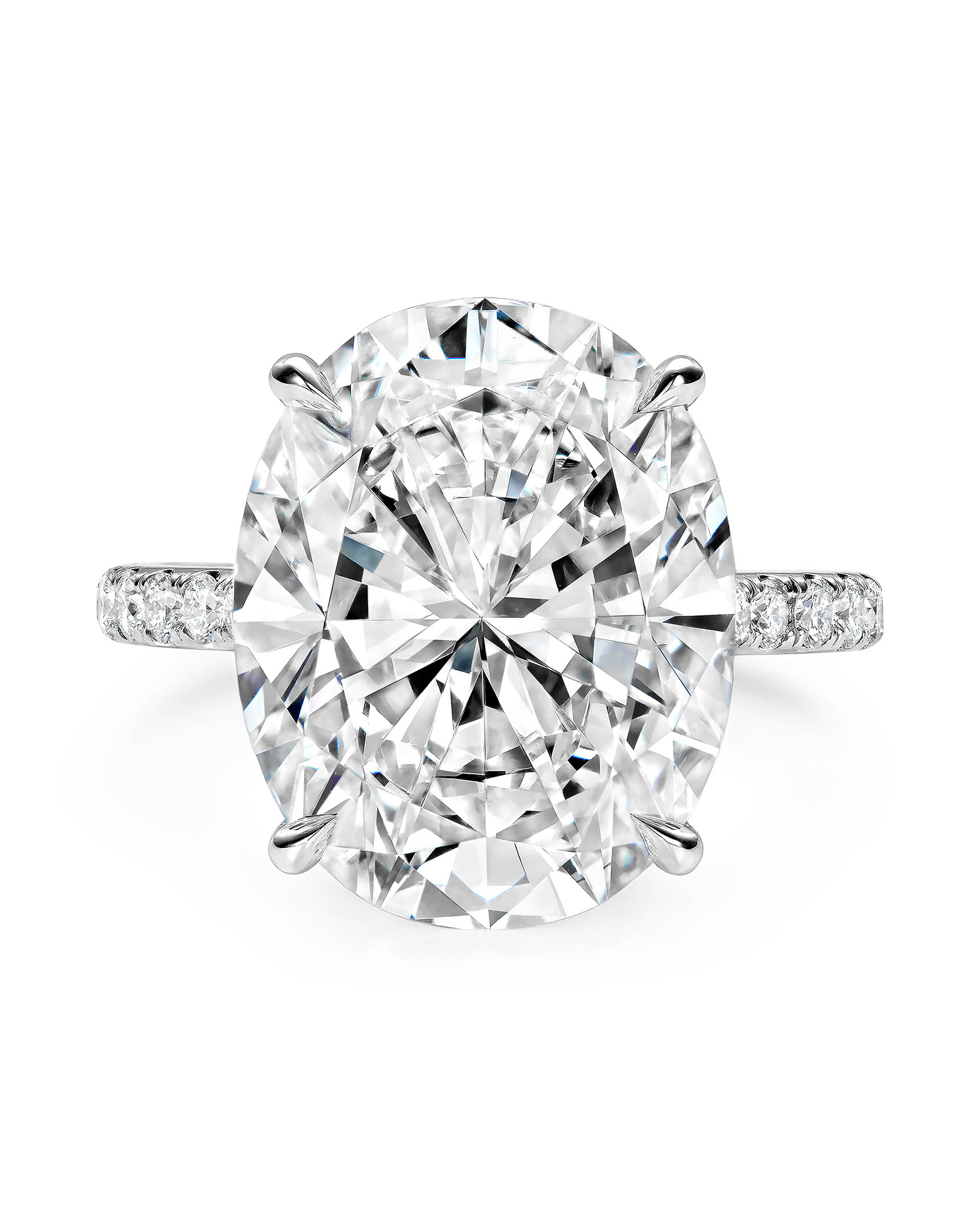 Platinum ring set with a 10.02 carat oval-cut diamond center (F-color and VVS-1 clarity) surrounded by 48 round brilliant cut diamonds (total weight of 0.70 carats, D-E color and VS-clarity) in the under gallery and 2/3 of the way around the band.