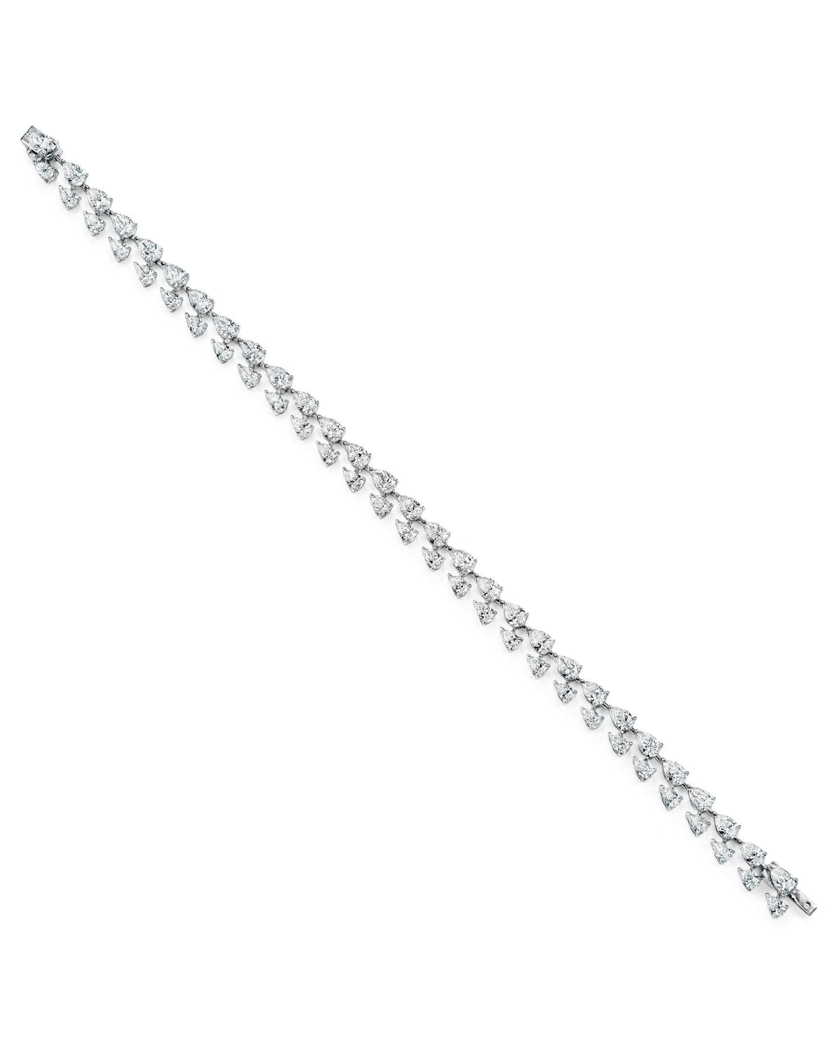 18 karat white gold bracelet 3-prong set with 58 pear shaped diamonds (total weight of 8.73 carats, G-H color and SI-clarity).