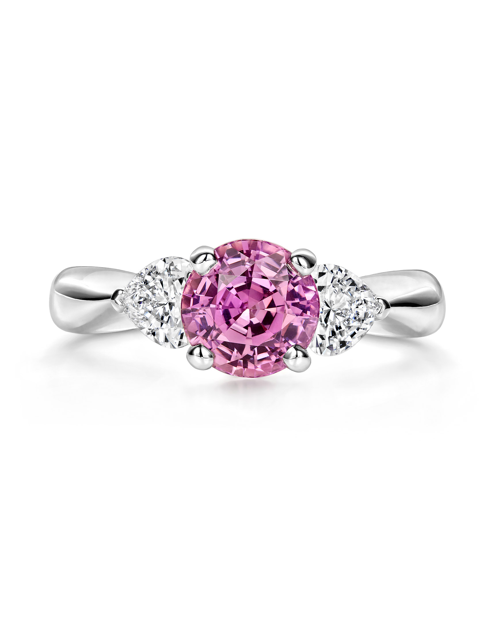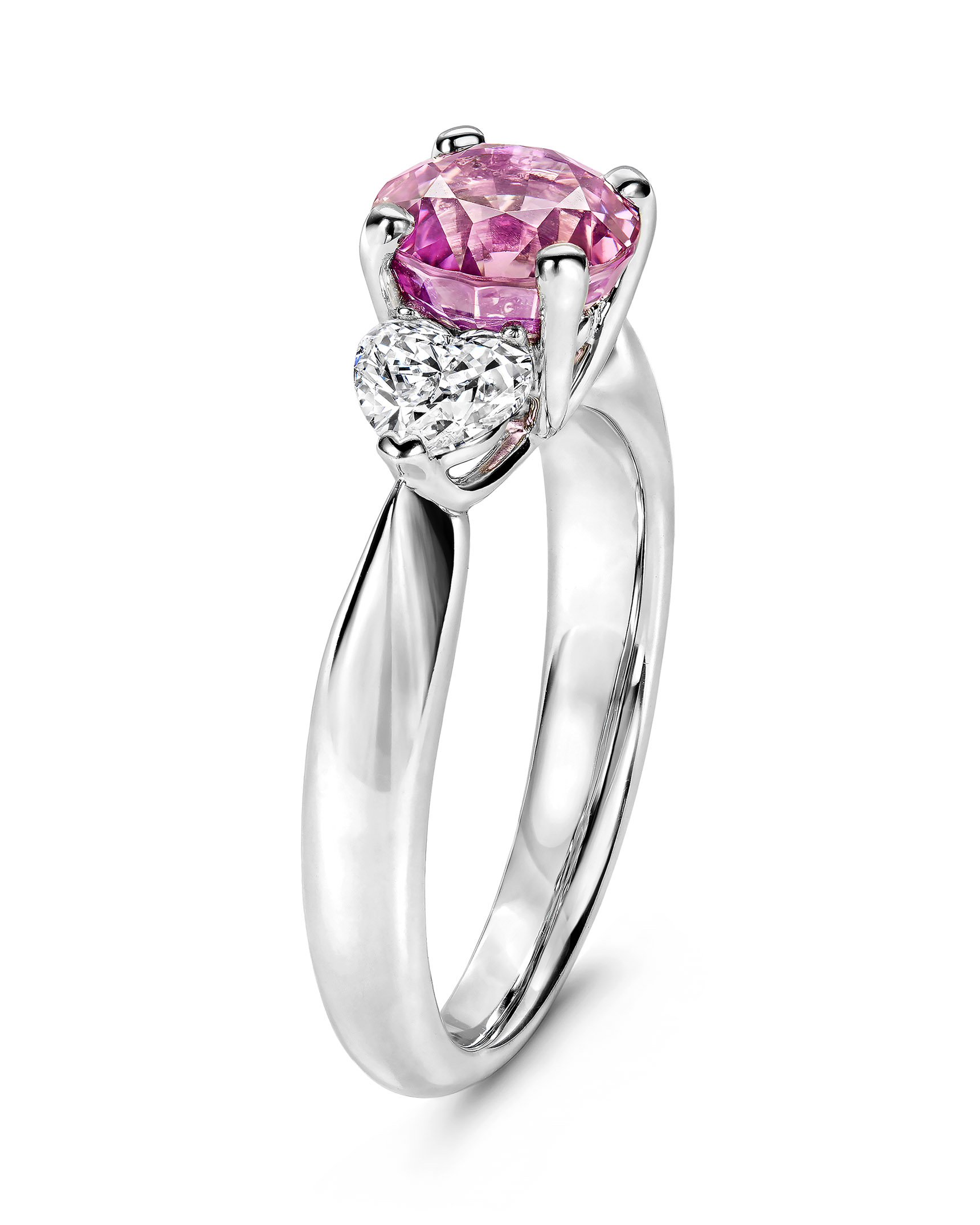 Platinum ring with a 2.21 carat rare round unheated pink sapphire with two heart-shaped diamonds (total weight of 0.66 carats) on the side.