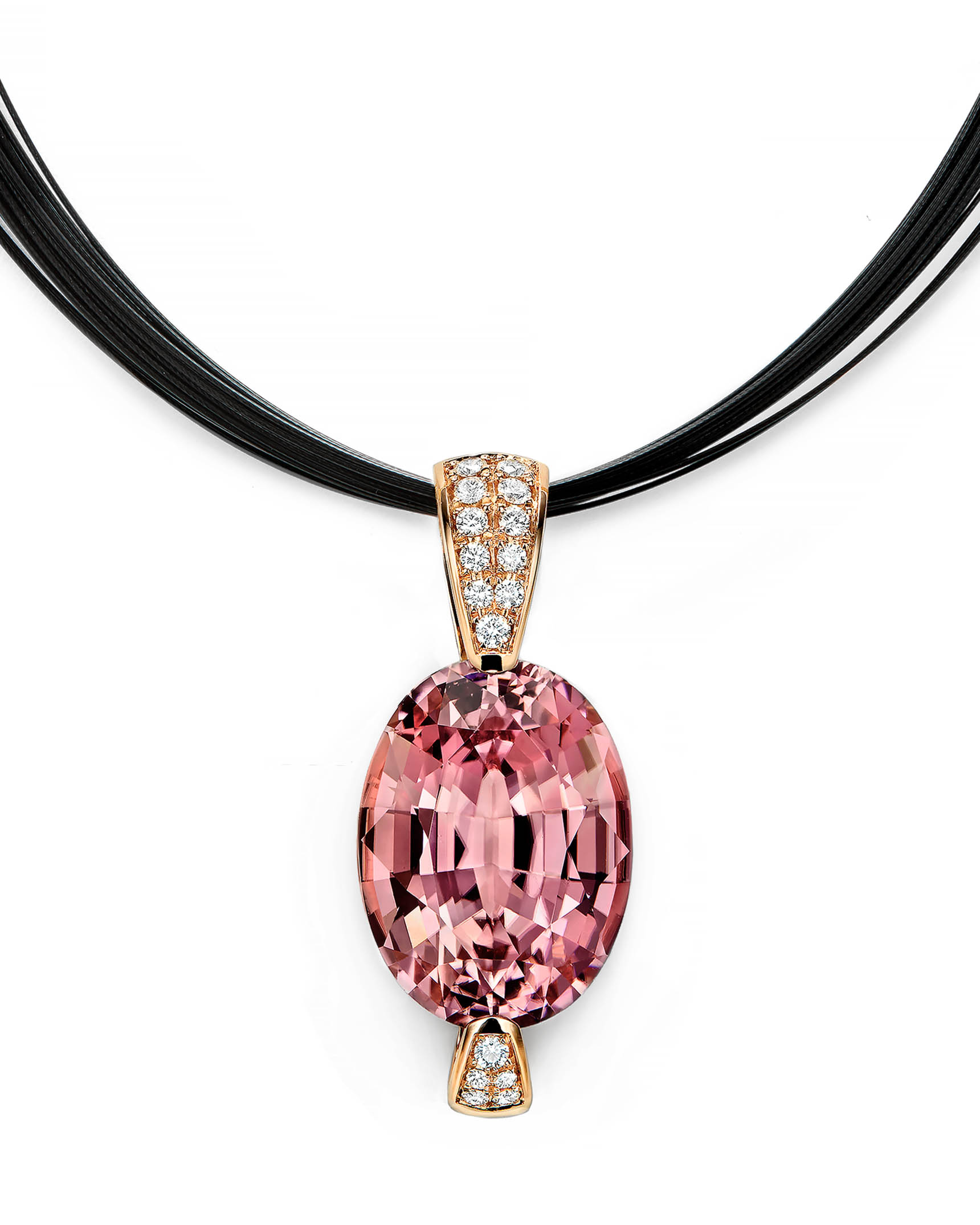 18 karat rose gold tapered pendant set with a 17.52 carat, oval pink tourmaline surrounded by a double row of 16 round brilliant cut diamonds (total weight of 0.23 carats, G-color and VS-1 clarity).