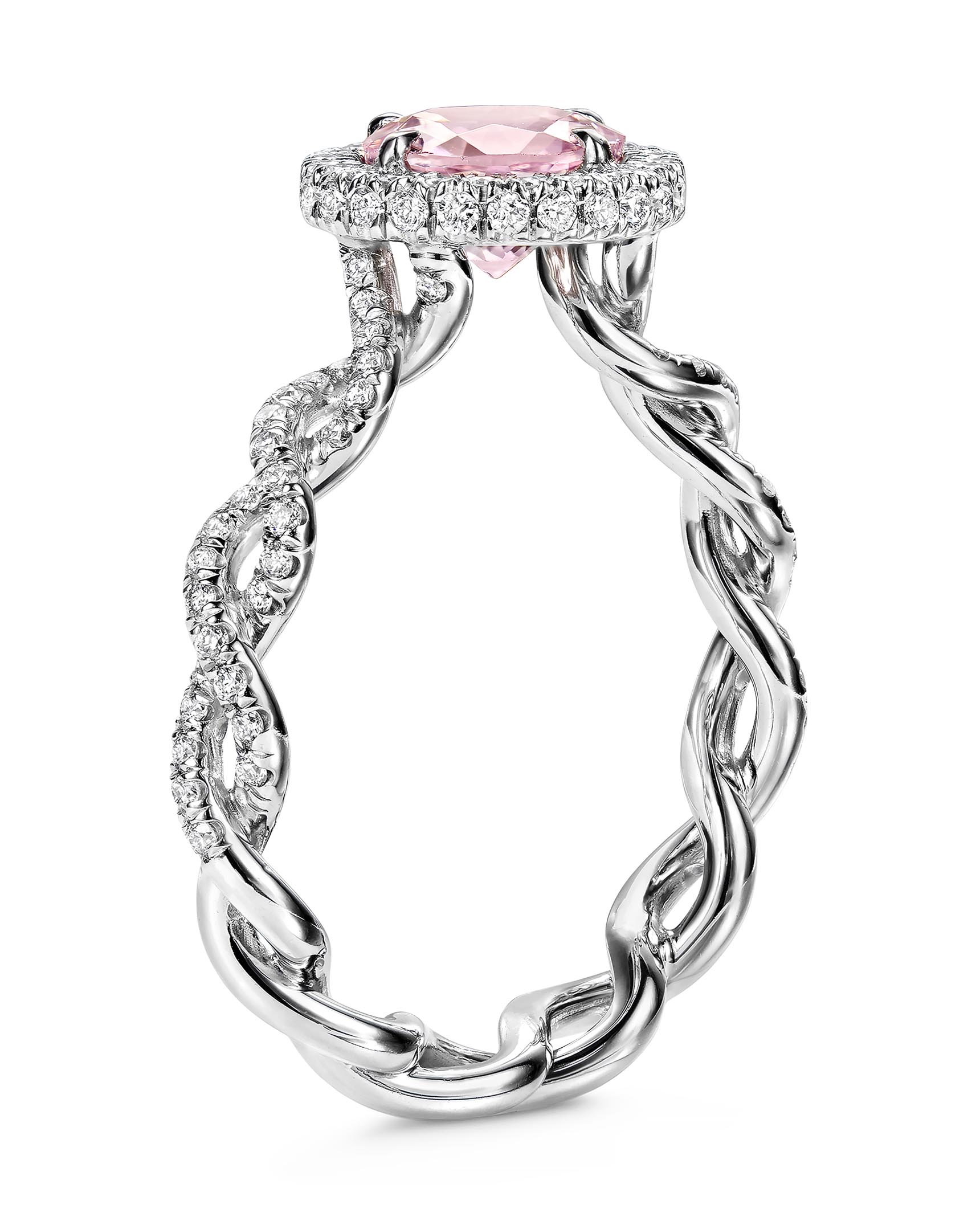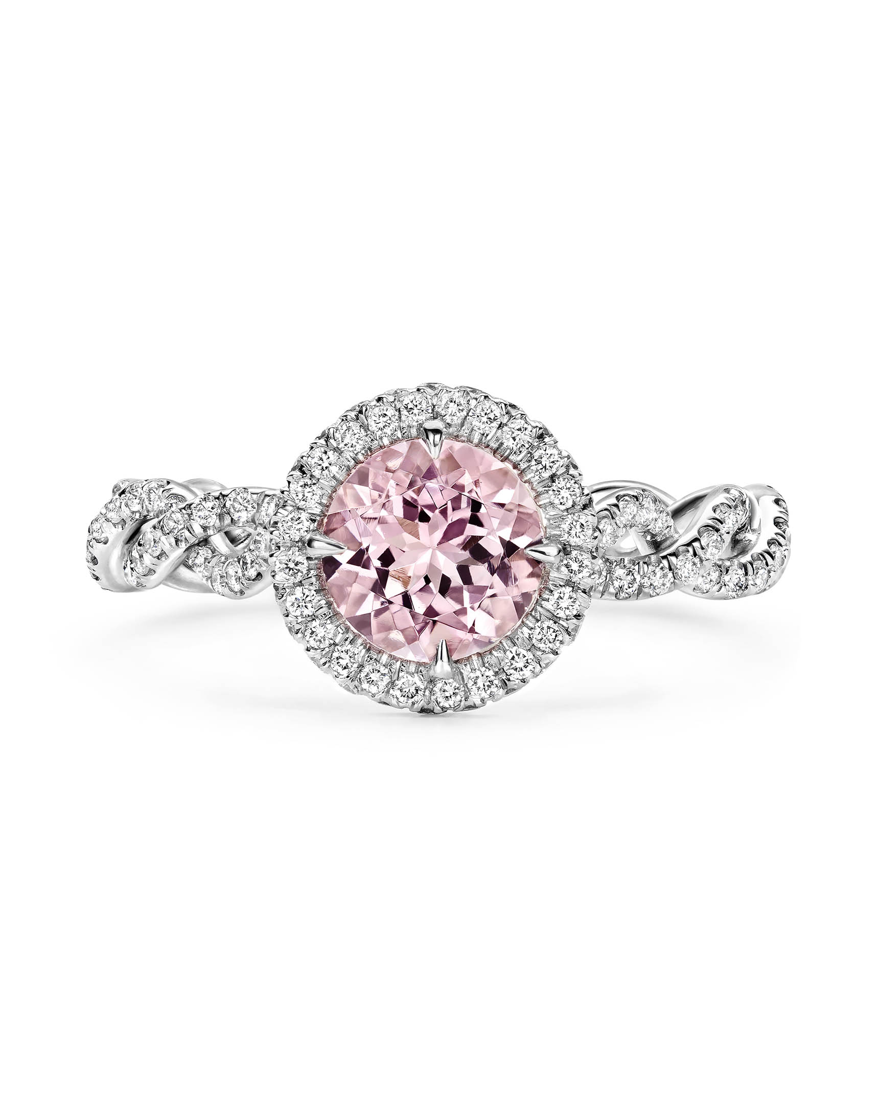 Round Pink Morganite and Diamond Halo Unity Twist Ring
