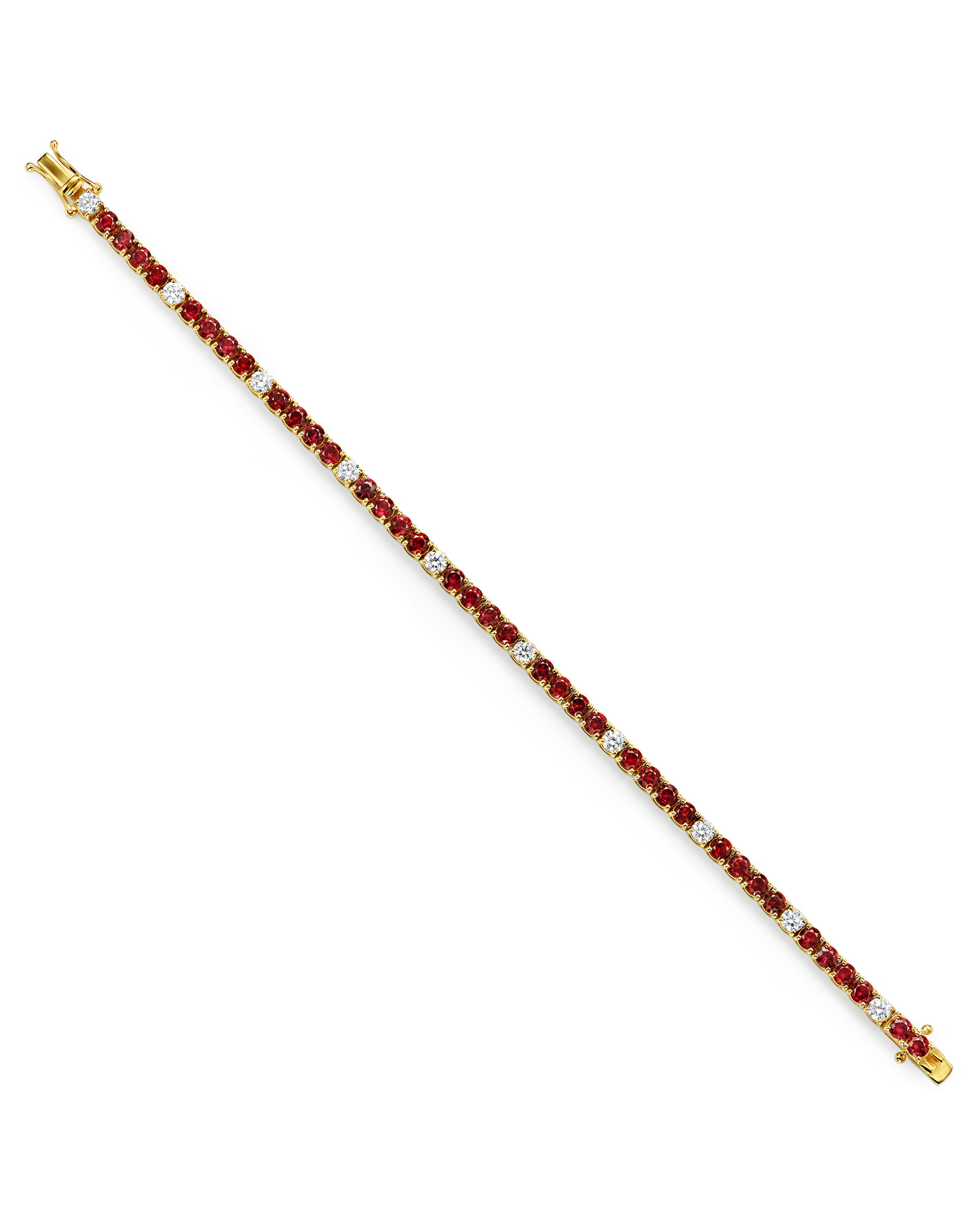 18 karat yellow gold bracelet prong-set with 38 round rubies (total weight of 7.12 carats) and 10 round brilliant cut diamonds (1.64 CTW, G-H color and VS-clarity).