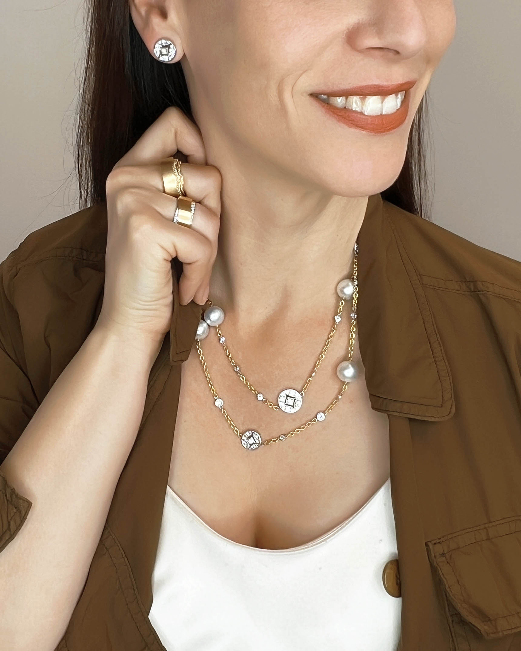 18 karat rose gold band with sliding sleeves set with 234 round brown diamonds (total weight of 0.935 carats) and 234 round brilliant cut diamonds (0.915 carats, F-color and VS-clarity).
