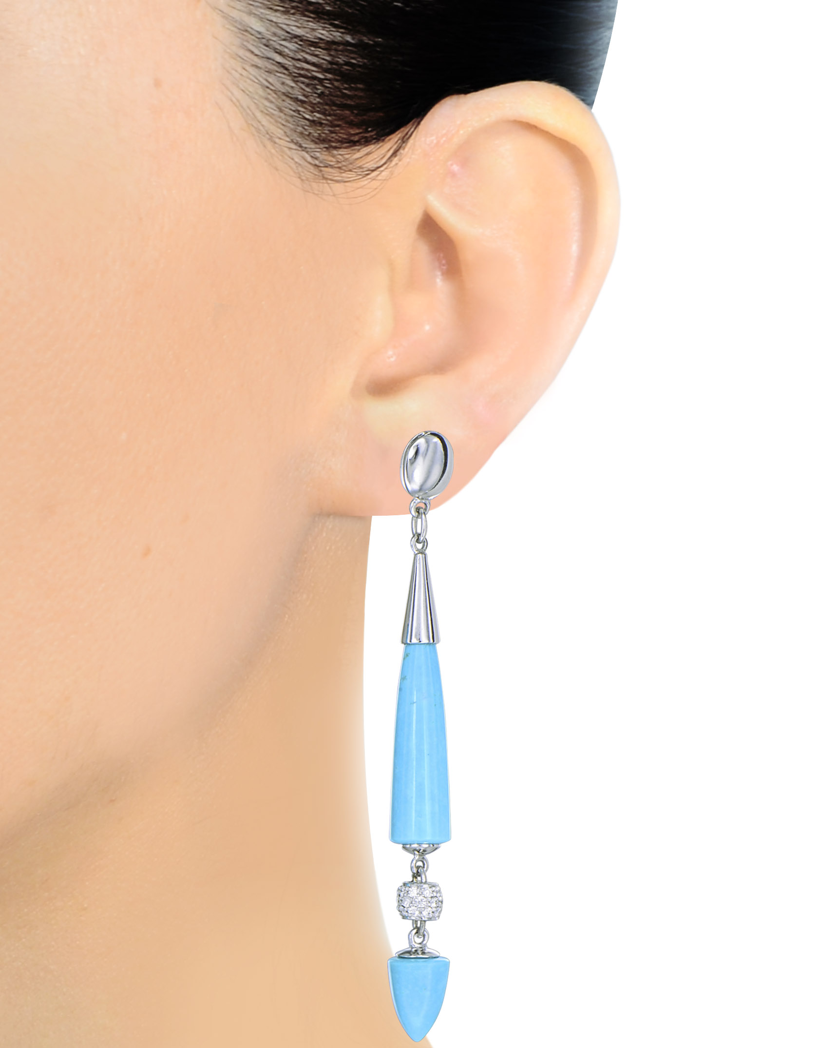 Pair of 18 karat white gold drop earrings set with turquoise and small round diamonds (total weight of 0.51 carats).