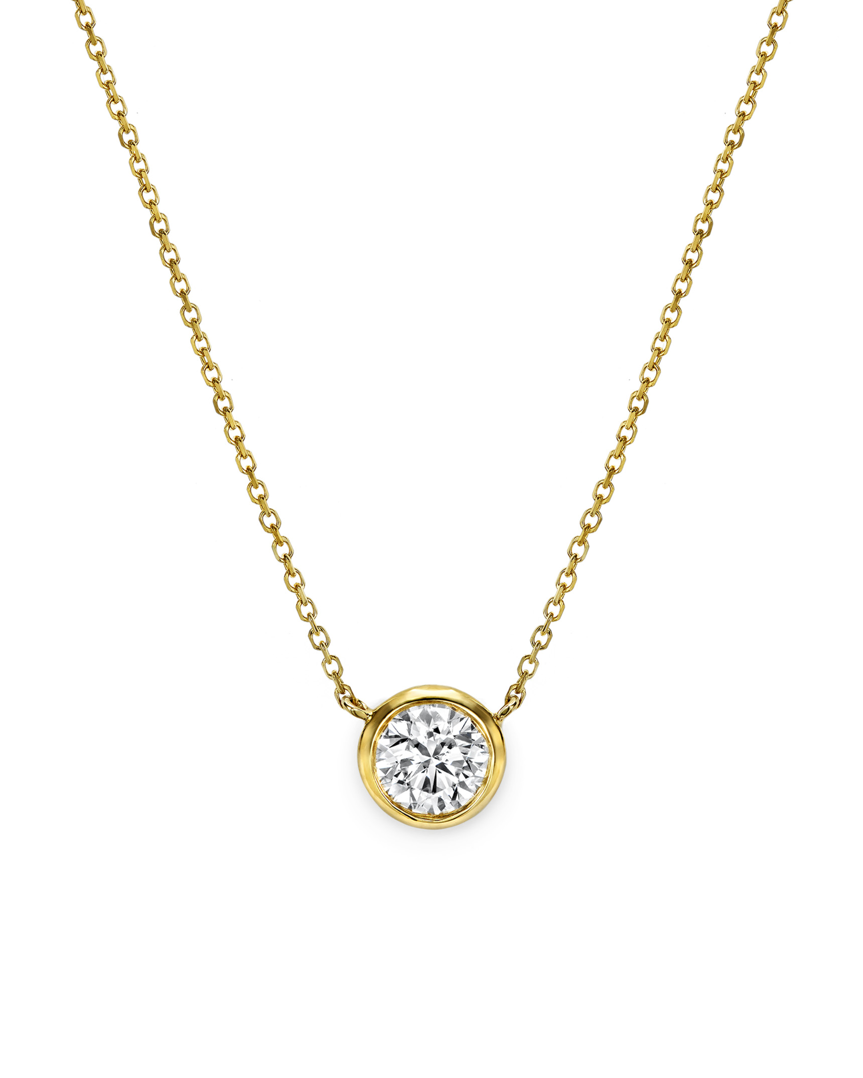 18 karat yellow gold diamond solitaire pendant necklace bezel-set with a 0.71 carat round brilliant cut diamond center (G-H color and VS-clarity).