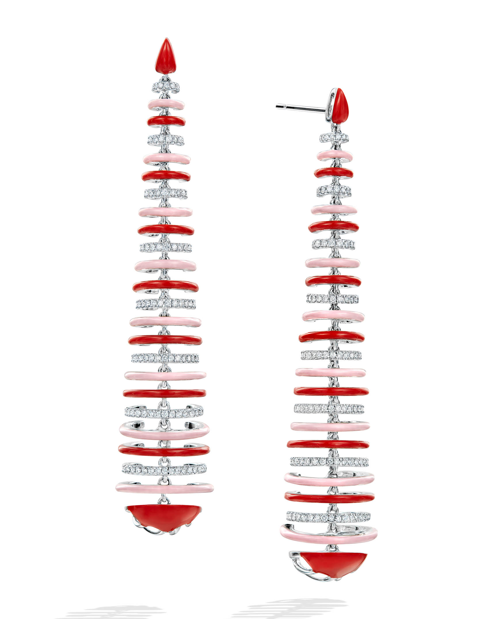 Diamond and Pink-and-Red Enamel Christmas Dangle Earrings