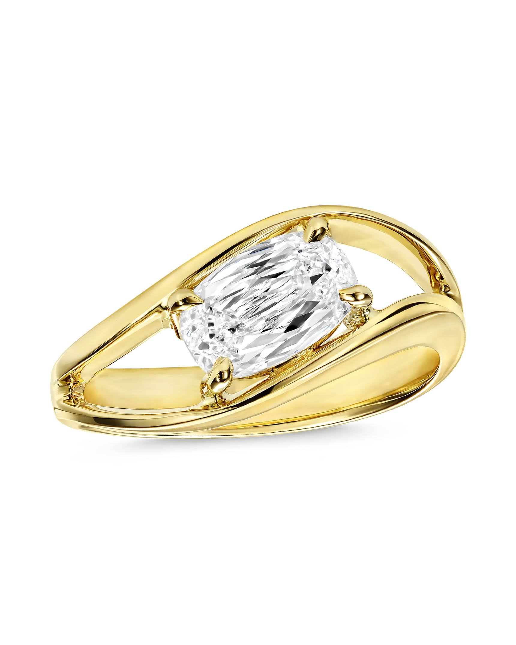 Cushion Diamond and Yellow Gold Double Wave Solitaire Ring
